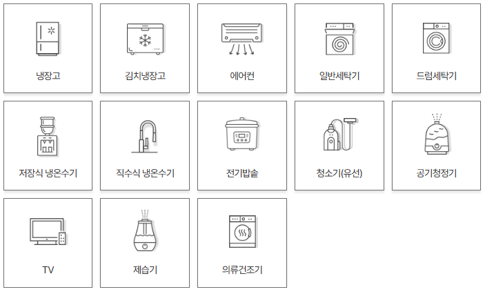 냉장고, 김치냉장고, 에어컨, 제습기, 건조기, 통돌이 세탁기, 드럼세탁기, 저장식 냉온수기, 직수식 냉온수기, 전기밥솥, 유·무선 청소기, TV가 해당됩니다.