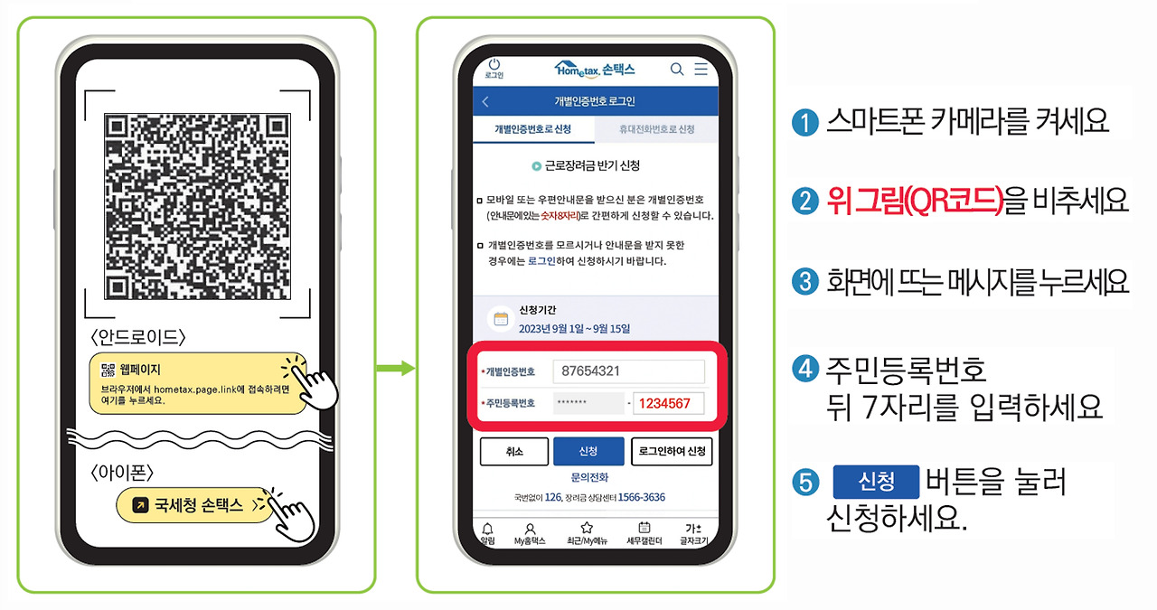 안내문 QR코드 스캔 → 개별인증번호 채워진 홈택스 모바일 앱 신청화면 이동 → 로그인 없이 주민등록번호 7자리 입력 → 신청