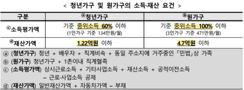 ✅ 소득/재산요건 : 청년 본인과 부모 등을 포함하는 원가구의 소득 및 재산을 고려한다.