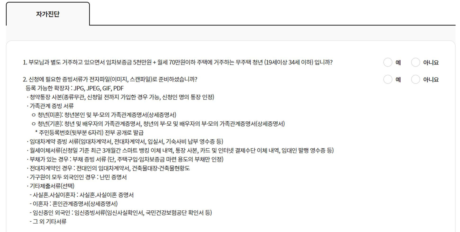 - 임대차계약 증빙서류(임대차계약서, 전대차계약서, 입실서, 기숙사비, 납부 영수증)